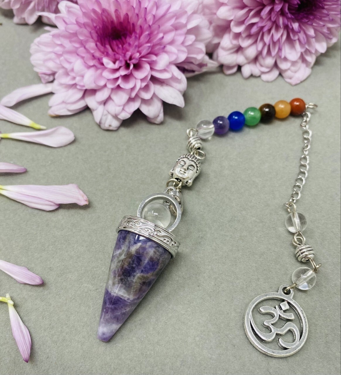 PÉNDULO DE CUARZO AMATISTA CON CADENA PARA LOS 7 VÓRTICES ENERGÉTICOS