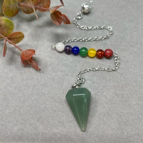 PÉNDULO DE VENTURINA VERDE CON CADENA PARA LOS 7 VÓRTICES ENERGÉTICOS MODELO 2